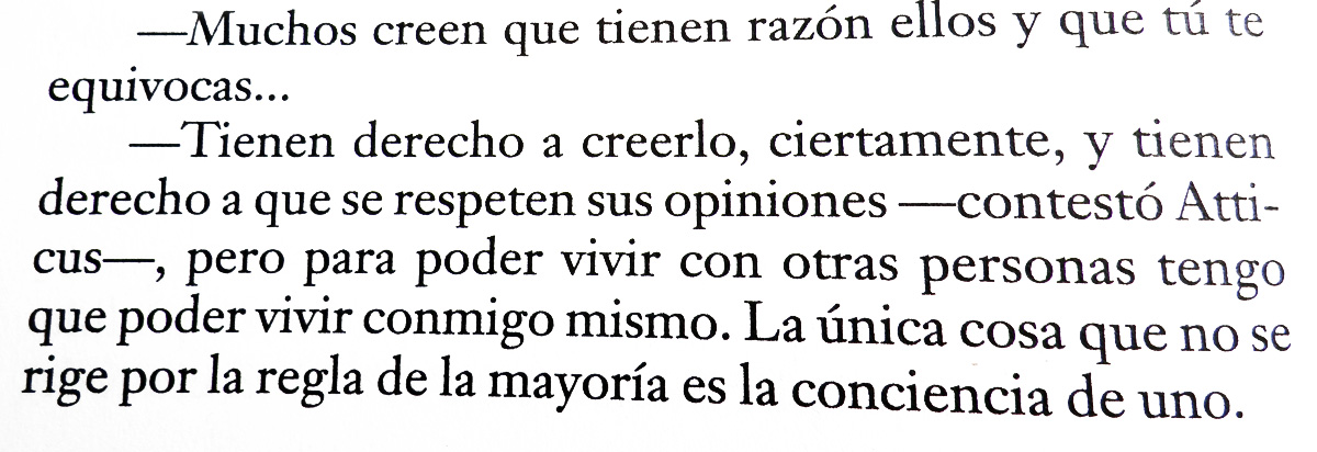 Sobre la Filosofía, creo que alguien puede leer a un autor y pensar cosas muy diferentes. A ti puede gustarte Jung y a mí no (es un decir). O cualquier persona puede venir a esta entrada y decirte: "No me ha gustado 'Un mundo feliz'", y no podrás reprocharle nada, ni censurarla, ni criticarla. ¿Por qué? porque todo es subjetivo, todo lo que se ve, se lee, se admira, se percibe, está marcado por tus vivencias, por el prisma con que miras la vida en función de cómo te ha ido la película. Y para mí todo es respetable, puesto que como dicen en "Matar a un ruiseñor", hay que ponerse en la piel de los demás para comprenderlos, y como bien comenta Atticus, lo más importante es la conciencia personal. Te dejo este pequeño párrafo para cuando las personas están en desacuerdo, qué es lo que debe primar (según mi parecer, claro):